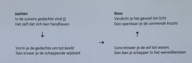 Rudolf Steiner was een grote en invloedrijke ingewijde uit de vorige eeuw. Tijdens het jaarlijkse congres van de Theosofische Vereniging in 1907 plaatste hij Jachien en Boaz aan weerszijden van het podium. De meestal gesloten deur uit Hirams tijd is dan al in een podium veranderd. Bij elke zuil gaf Steiner twee spreuken. De vier spreuken vormen evenveel stappen op een inwijdingsweg die verwant is met die uit de Mithrasmysteriën. Bewandel je haar, dan merk je welke offers de weg vraagt.